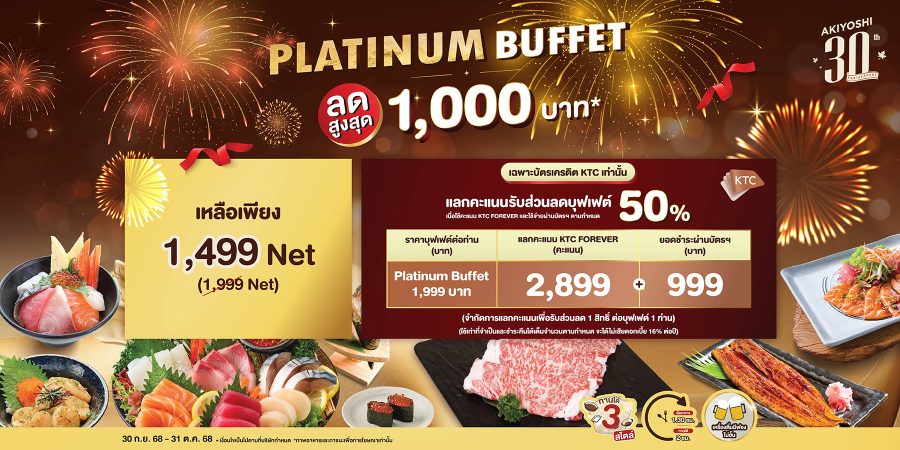 วันเกิดร้านอะคิโยชิทั้งที…ขอมอบความคุ้มค่าสุดพิเศษ ให้แพ็กเกจ Platinum Buffet ลดสูงสุด 1,000 บาท* เหลือเพียง 999 บาทเน็ต อร่อยจัดเต็มกับเมนูรวมกว่า 180 เมนู เฉพาะสาขาพระโขนงเท่านั้น
