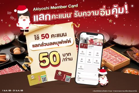 50 คะแนน แลกรับส่วนลดบุฟเฟต์ 50 บาท/ท่าน ใน App AKIYOSHI